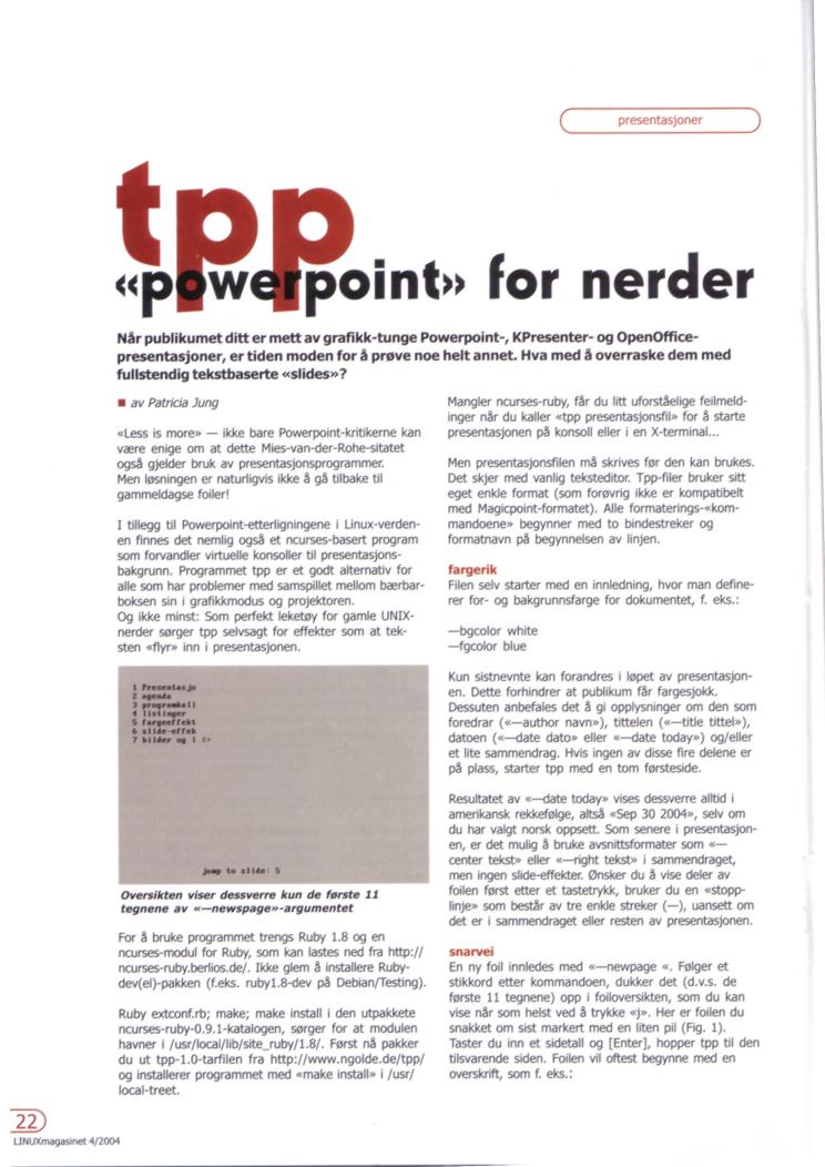 tpp stands for text presentation program and is an ncurses-based presentation tool. The presentation can be written with your favorite editor in a simple description format and then shown on any text terminal that is supported by ncurses - ranging from an old VT100 to the Linux framebuffer to an xterm.
